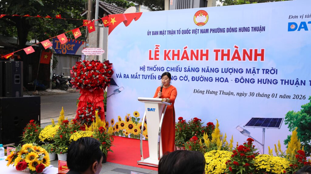 Ngày 30/01/2026, Ủy ban MTTQ Việt Nam phường Đông Hưng Thuận phối hợp cùng DAT Group đã tổ chức thành công lễ khánh thành và bàn giao hệ thống chiếu sáng năng lượng mặt trời trên tuyến đường Đông Hưng Thuận 10, phường Đông Hưng Thuận, TP HCM, với sự tham gia của đại diện Chính quyền địa phương, đại diện Ban Lãnh đạo DAT Group, cùng nhiều đơn vị báo đài, người dân đang sinh sống và làm việc tại đường Đông Hưng Thuận 10.