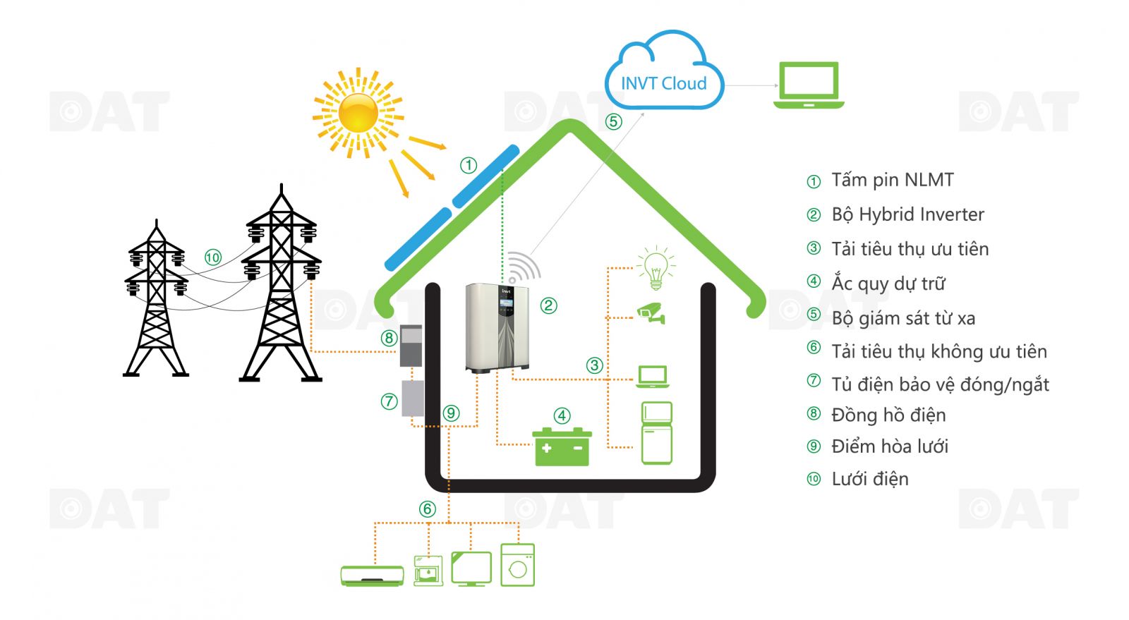 - Sử dụng nguồn PV + Pin lưu trữ + Điện lưới + Máy phát điện