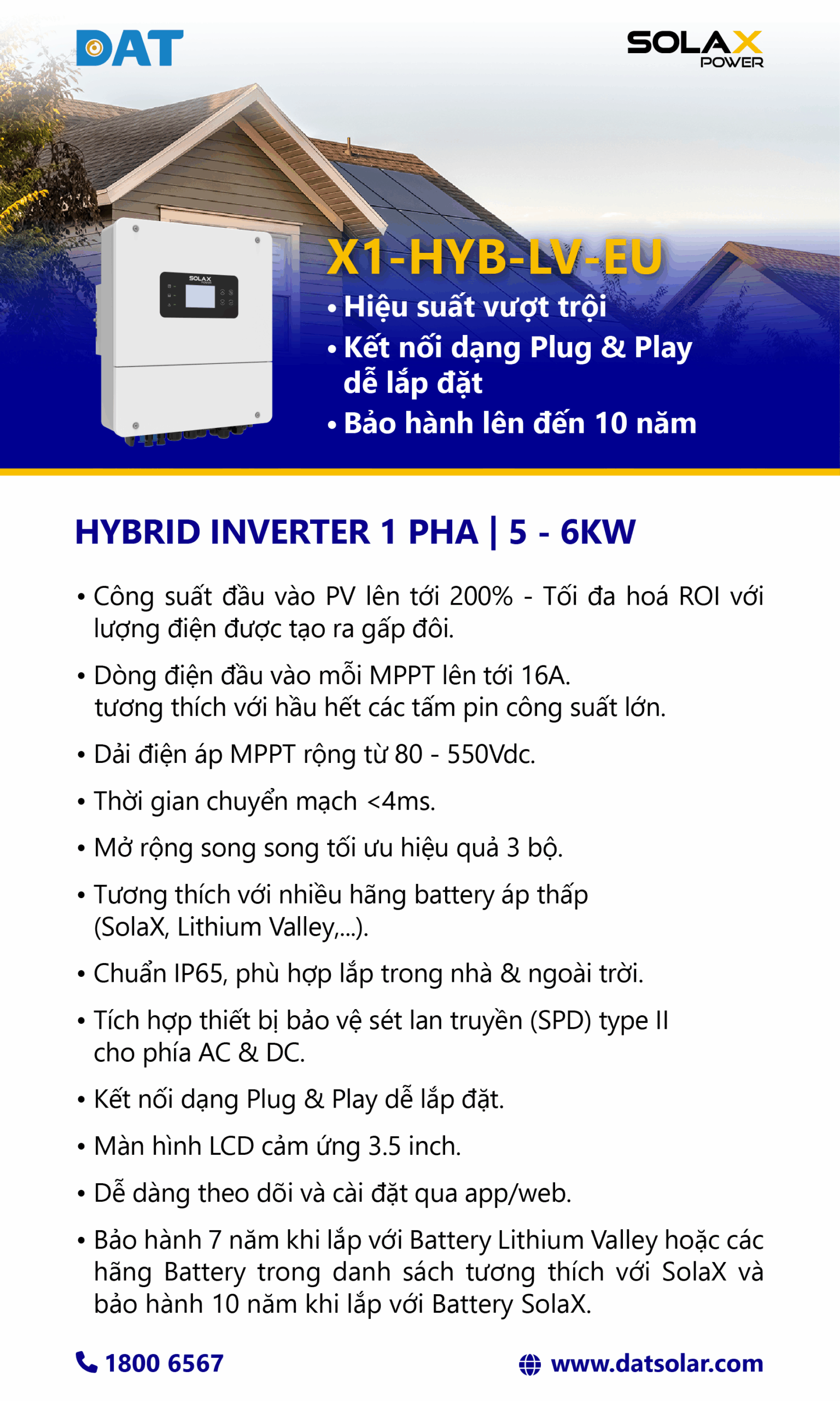Hybrid Inverter SolaX X1-HYB LV-EU 1 Pha áp thấp (5–6kW) là dòng inverter lưu trữ được thiết kế tối ưu cho dân dụng, nổi bật với hiệu suất vượt trội, độ tin cậy cao và khả năng tương thích linh hoạt với nhiều loại pin lưu trữ áp thấp. Đây là lựa chọn lý tưởng để tối ưu hóa hiệu quả đầu tư và chủ động nguồn điện xanh, an toàn, bền vững.